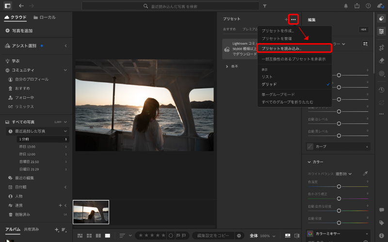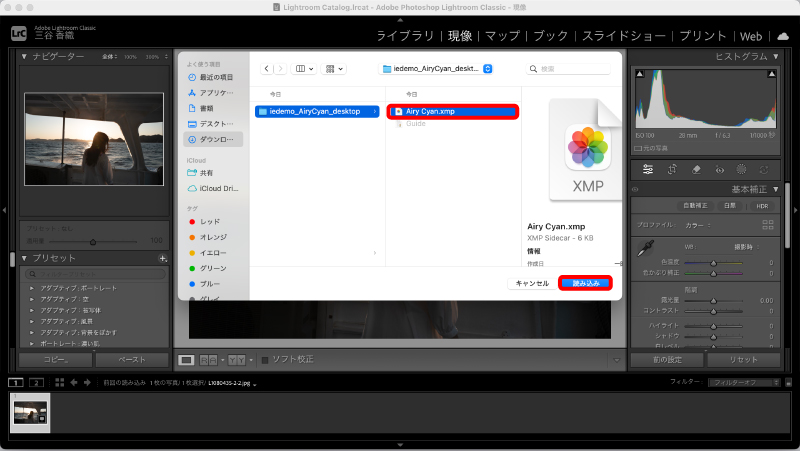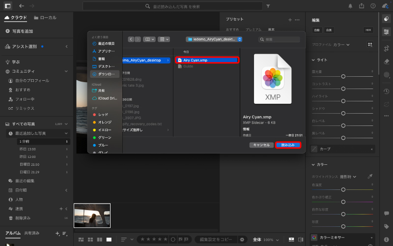 Adobe Lightroomのプリセット追加方法【デスクトップ版】 このページでは、パソコン(Windows / Mac)でLightroomプリセットを追加する方法をご案内します。はじめての方でも、手順通りに進めるだけですぐにご利用可能です。Adobe Lightroomには「Lightroom(クラウド版)」と「Lightroom Classic(デスクトップ管理型)」の2種類があり、どちらも、iedemo graphyのプリセットをご利用いただけます。 STEP 1|プリセットをダウンロードする プリセットのダウンロード方法は、デスクトップ・モバイル共通です。 ※ ダウンロード後は、お使いの端末にファイルを保存してください。 ※ ダウンロード期限は、購入日から7日間です。 ※ ダウンロードは、最大5回までご利用いただけます。 ※ 期限内・回数内に、必ずファイルを保存してください。 ダウンロード方法①:会員登録せずに購入した方(ゲスト購入) 以下の2通りの方法でダウンロードいただけます。 ・購入完了画面から:決済完了直後の画面に表示される「ファイル名(例:iedemo_presetname.zip)」をタップまたはクリックして保存してください。・メールから:注文確定後に自動送信されるご注文完了メール内のURLからダウンロードしてください。 【購入完了画面から】 【注文確認メールから】 ダウンロード方法②:会員登録をして購入した方 会員登録をして購入された方は、以下の3つの場所からダウンロードが可能です。 ・購入完了画面から:決済直後の画面に表示される「ファイル名(例:iedemo_presetname.zip)」をタップまたはクリックして保存してください。・マイページから:ログイン後、メニューの「ダウンロード」より再ダウンロードが可能です。(ダウンロード期限:購入から7日間 / 回数:最大5回まで)・メールのリンクから:自動送信される注文完了メール内のURLをクリックするとログイン画面が表示されます。 ログイン後、マイページ内の「ダウンロード」より保存してください。 ※ ご注文完了後、ご登録のメールアドレスに「iedemo shop アカウントが作成されました。」という件名のメールが届きます。メール内の「新規パスワードを設定します」リンクからパスワードを設定し、アカウントを有効化してください。 【マイページからのダウンロード手順】 右上のアイコンから「マイページ」へ進む 設定したメールアドレスとパスワードでログインする メニューから「ダウンロード」を選択する 「ファイル名」をタップまたはクリックして保存する 【ご注意】 ※ ダウンロードしたファイルが「zip形式」の場合は、必ず解凍してからLightroomに読み込んでください。Macをご利用の場合は、zipファイルをダブルクリックすると自動で解凍されます。解凍後、フォルダの中に「.xmp」ファイルが入っていれば、インストールの準備は完了です。 STEP 2|プリセットをインストールする ※本ページの画面はMac版Lightroomを使用しています。Windowsでも操作手順はほぼ同じですので、安心して進めてください。 ① Lightroomを起動する ② 「プリセットを読み込み」を選択 Lightroom ClassicとLightroom(クラウド版)では、画面表示が一部異なります。以下をご利用のバージョンにあわせてご確認ください。 【Lightroom Classic】をお使いの方 プリセットパネルの「+」をクリックし、「プリセットを読み込み…」を選択する ダウンロードした「.xmpファイル」を選択する 読み込み完了後、左側のパネルからプリセットを選択して適用する。 【Lightroom(クラウド版)】をお使いの方 右上の「プリセット」アイコンをクリックする 「…」をクリックし、「プリセットを読み込み…」を選択する ダウンロードした「.xmpファイル」を選択する 読み込み完了後、右側の「プリセット」一覧から選択して適用する 一度読み込みを行うと、次回からはワンクリックで簡単に呼び出すことができます。写真の雰囲気や光の状況に合わせて、露出や色調を自由に調整し、あなただけの色を表現してみてください。※「すべての項目を読み込み済みです」と表示される場合、すでに登録されている可能性があります。プリセット一覧にある検索機能から、ご購入いただいたプリセット名で検索をお試しください。 ※Windowsをご利用の方で操作が分からない場合は、Adobe公式ヘルプもあわせてご確認ください。 Adobe公式:プリセットの読み込み方法はこちら